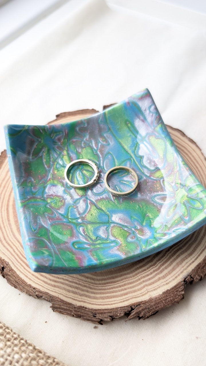 Blue Floral Trinket Dish - A beautiful subtle sparkly mix of clay creating a mocume gane effect on the clay with a floral pattern.