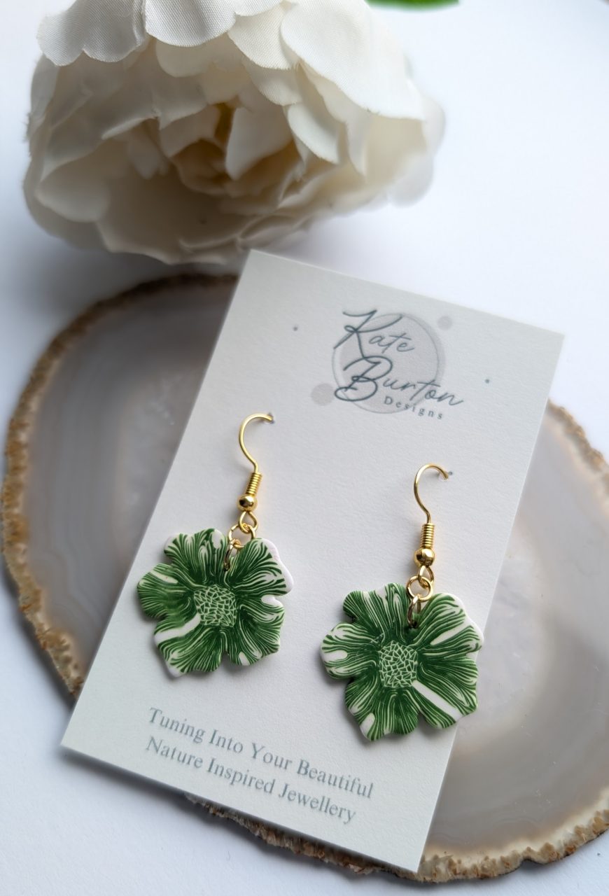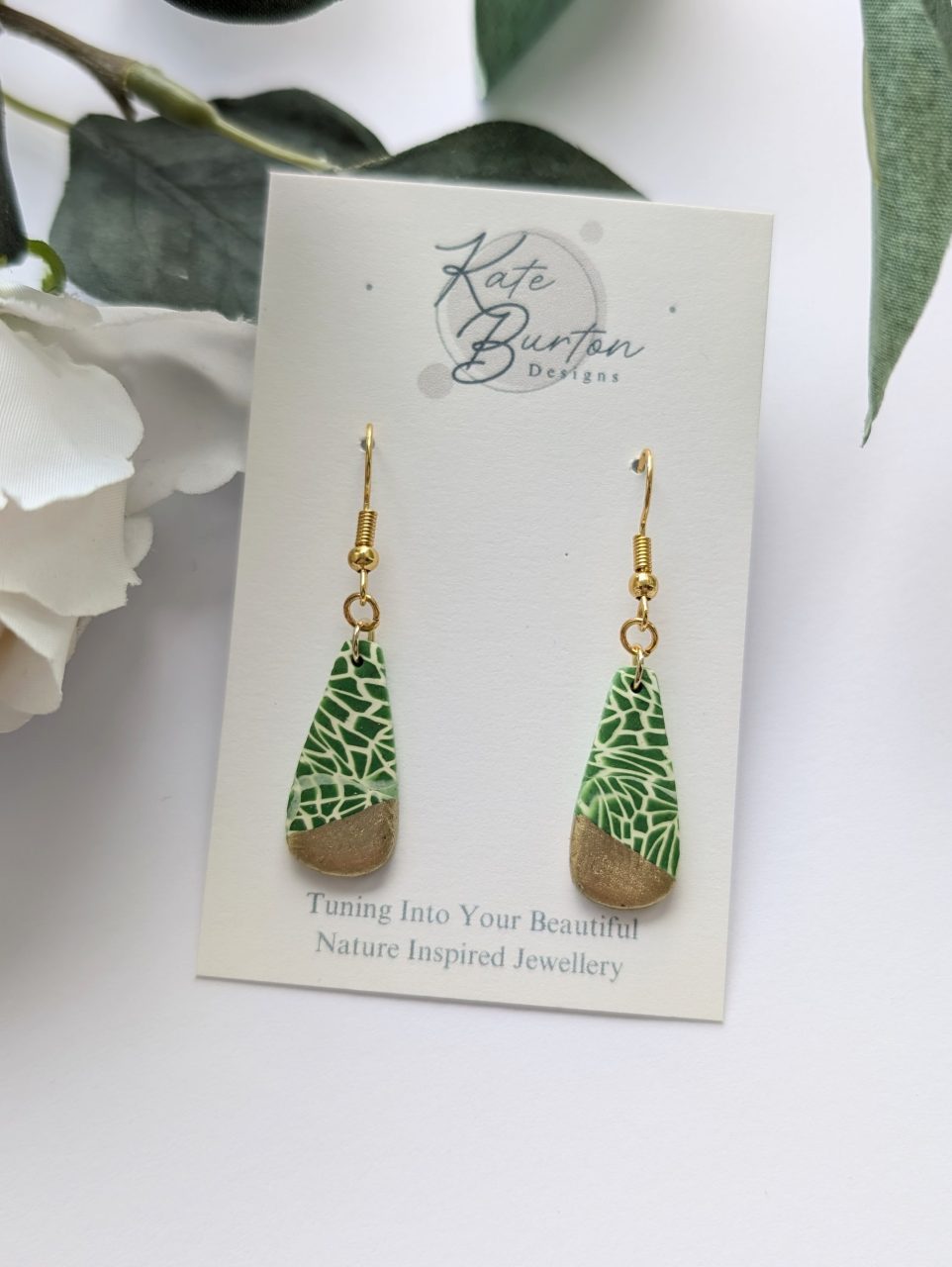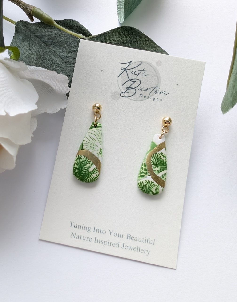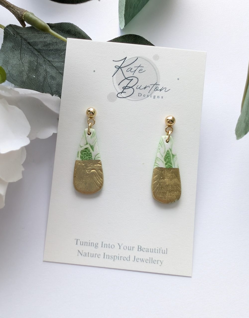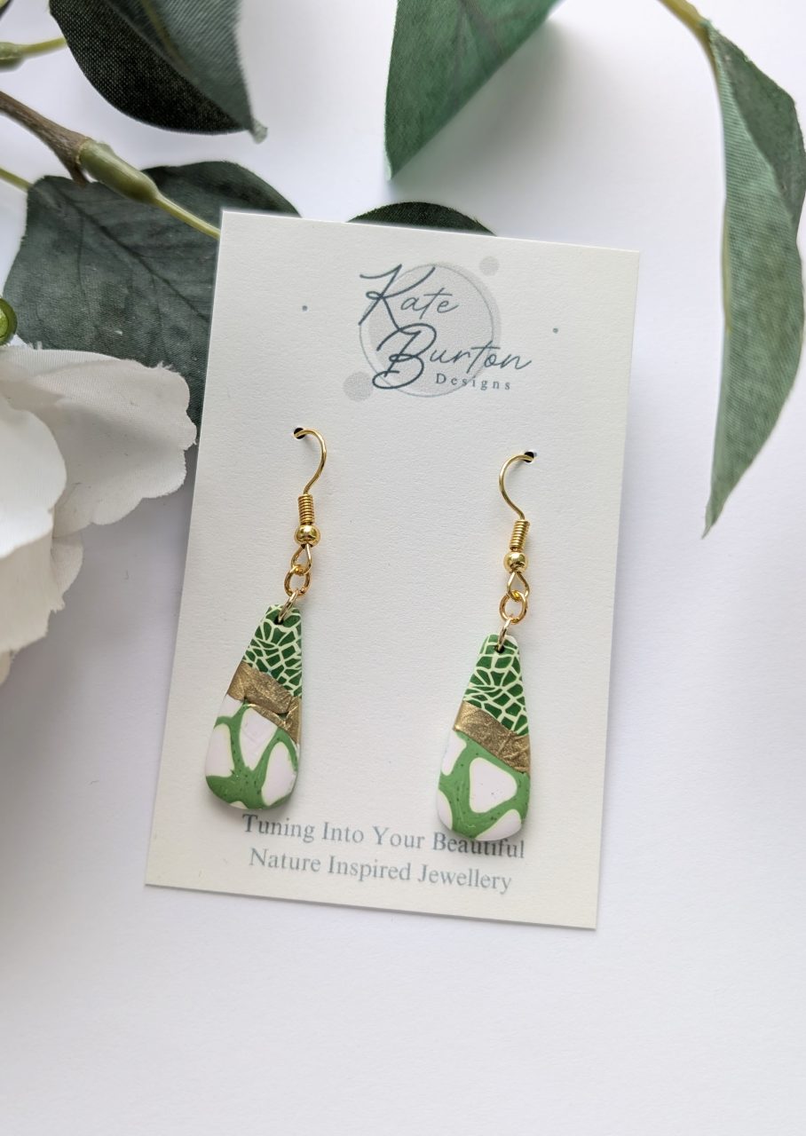 Beautiful Green, White and gold floral earrings - pattern created using various flower canes. Stunning Spring and Summer colours.