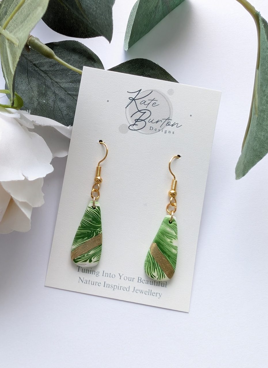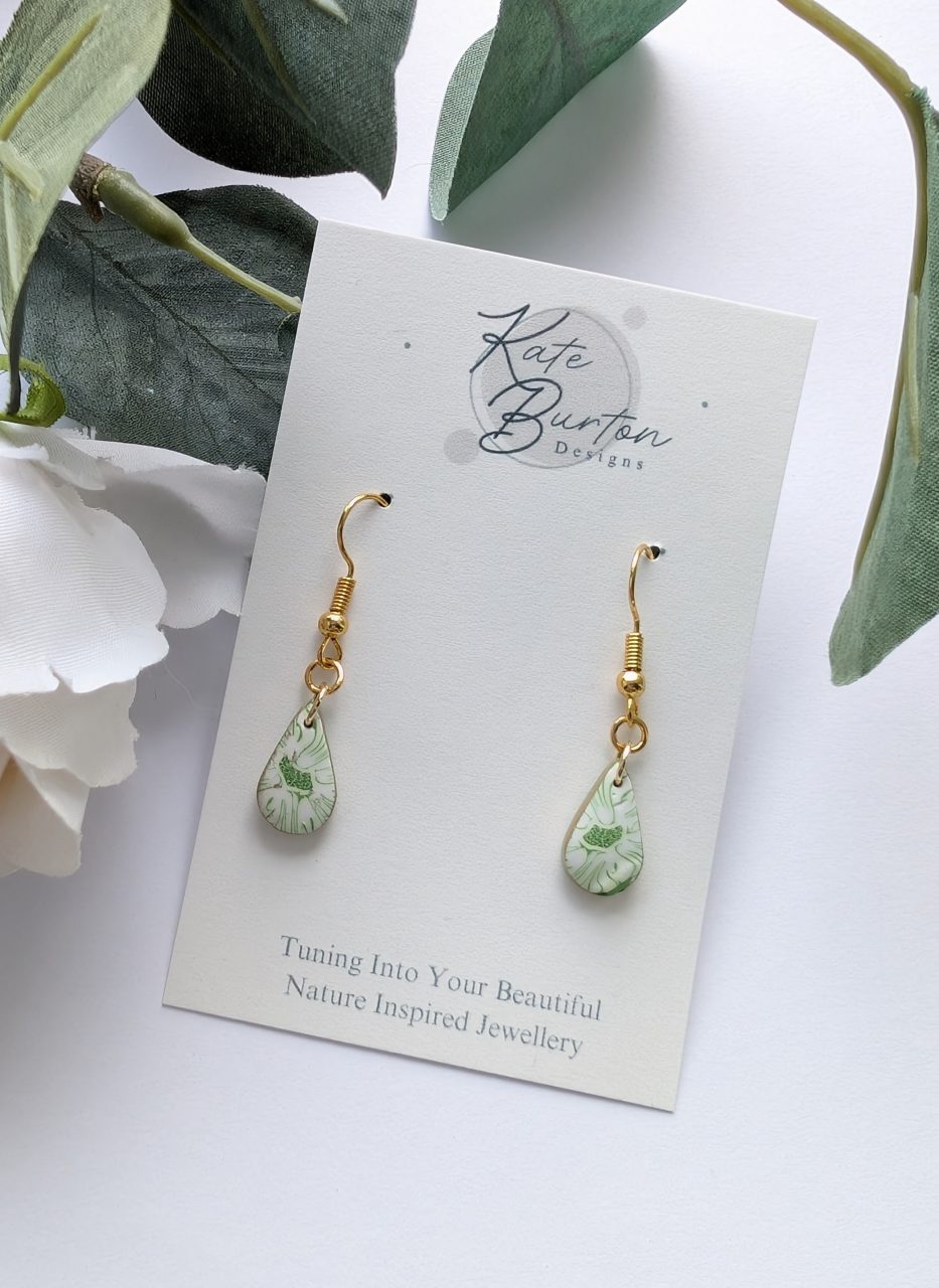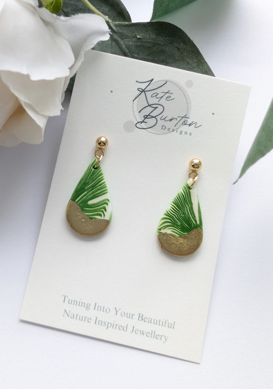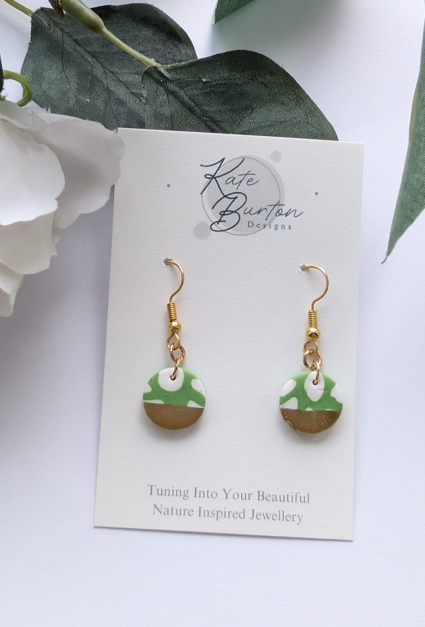Beautiful Green, White and gold floral earrings - pattern created using various flower canes. Stunning Spring and Summer colours.
