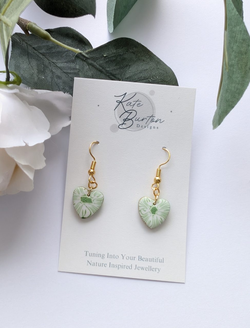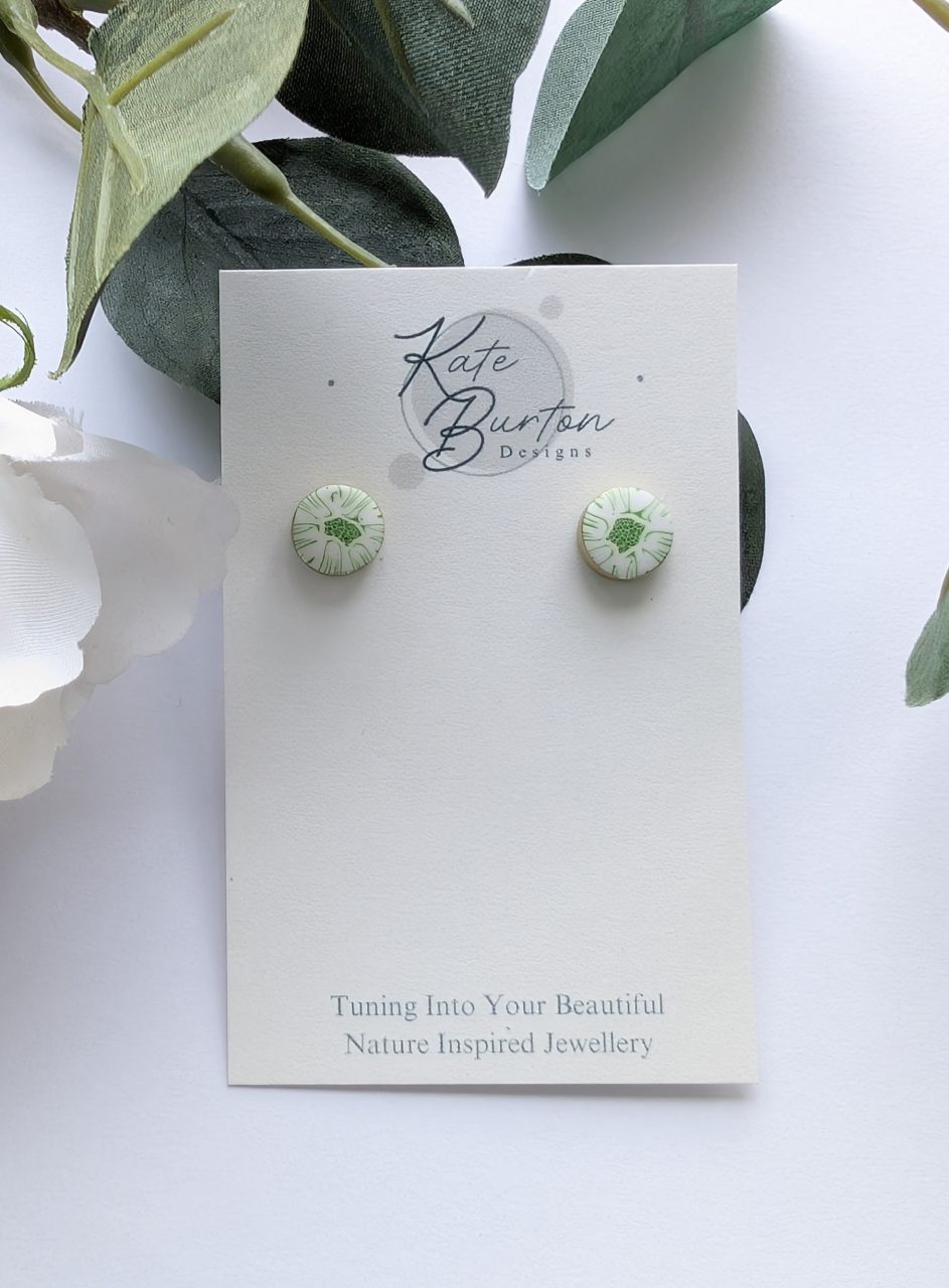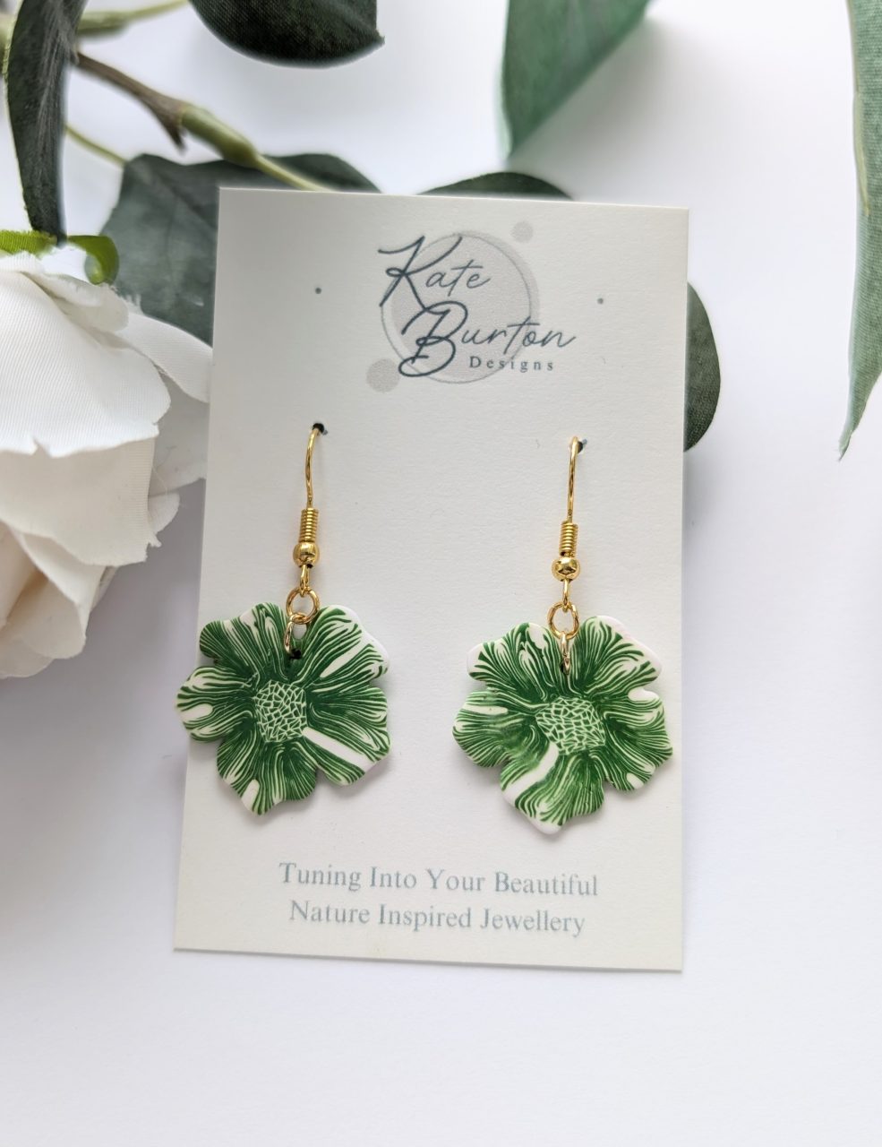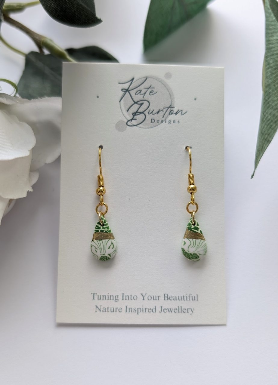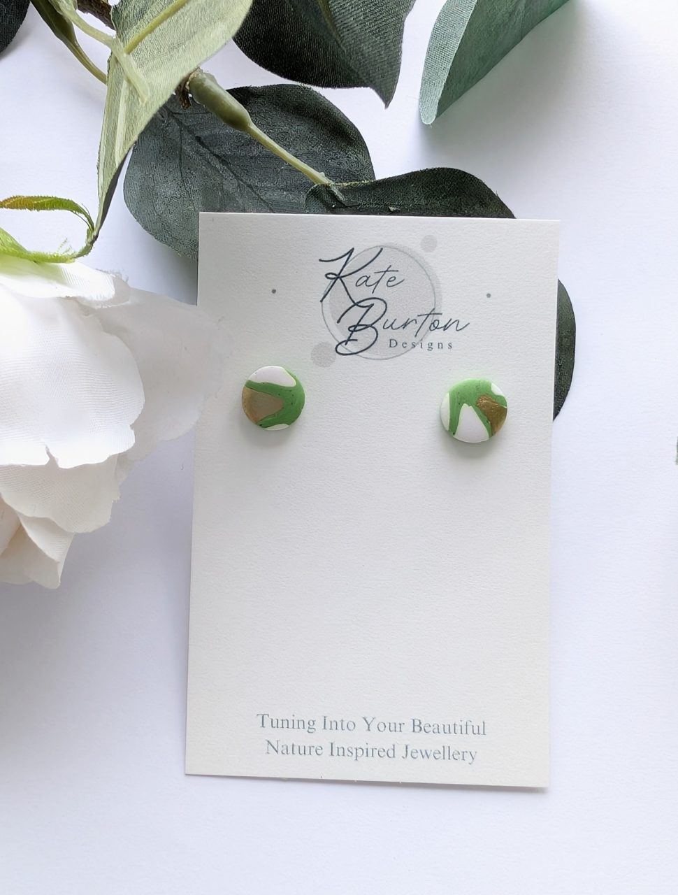 Beautiful Green, White and gold floral earrings - pattern created using various flower canes. Stunning Spring and Summer colours.