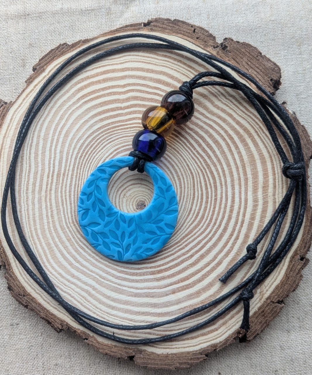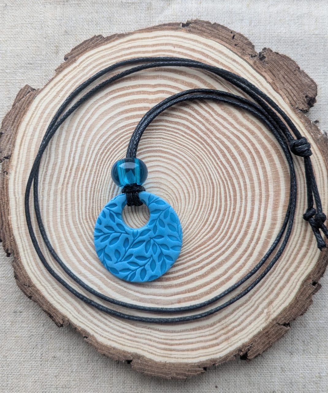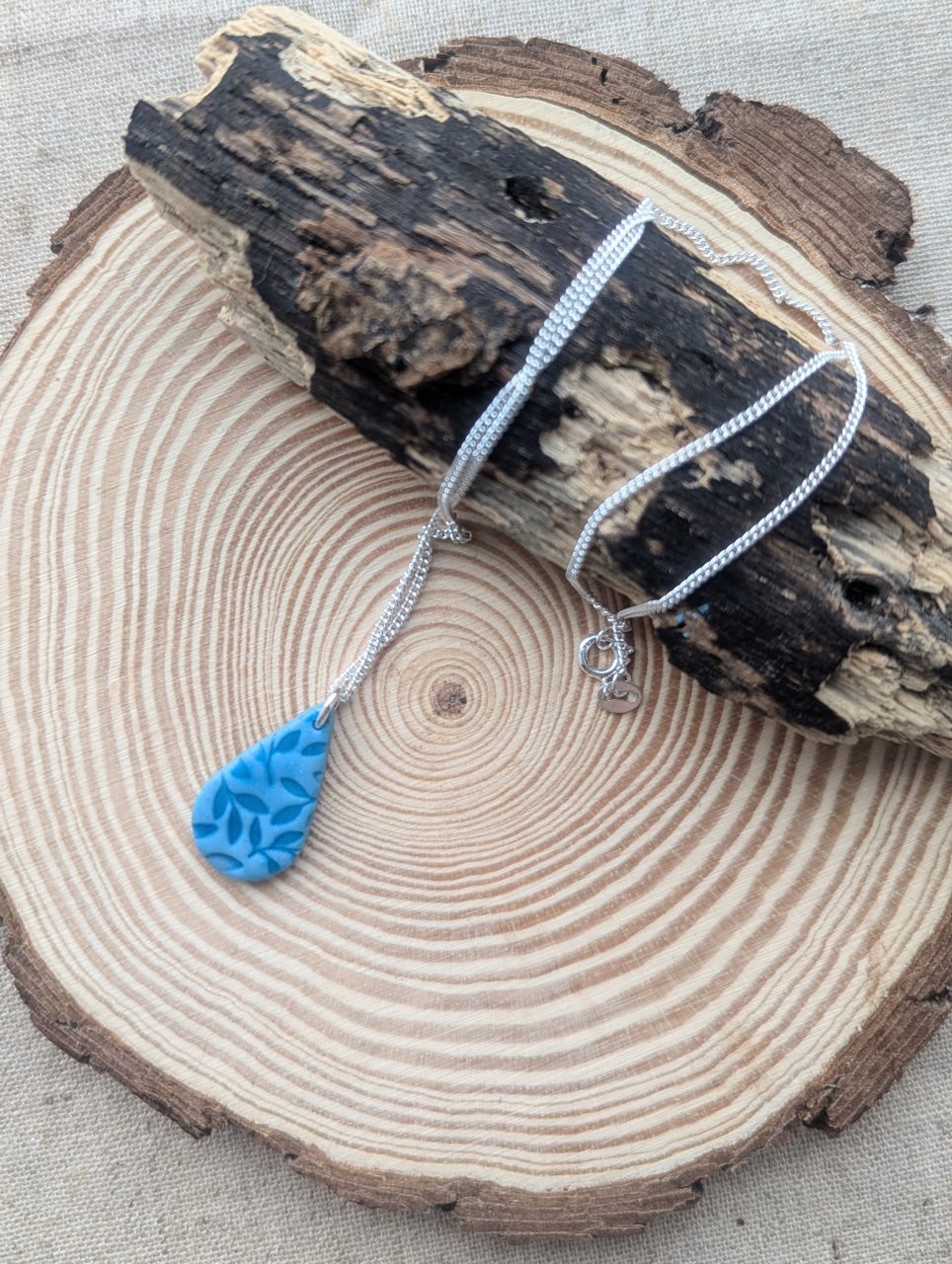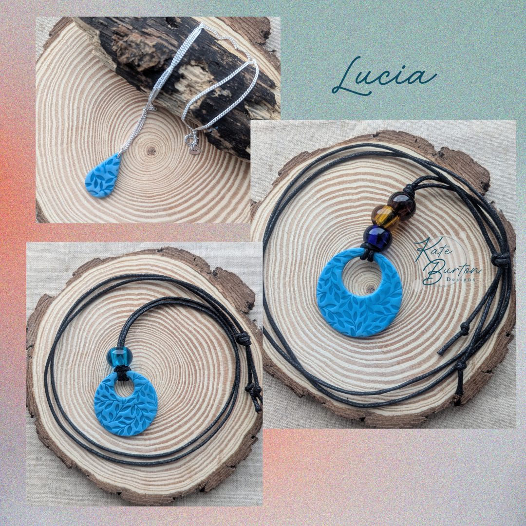 Lucia Necklaces - Beautiful blue embossed necklaces on cord adjustable chains or sterling silver. Both bold and delicate designs in soft blue.
