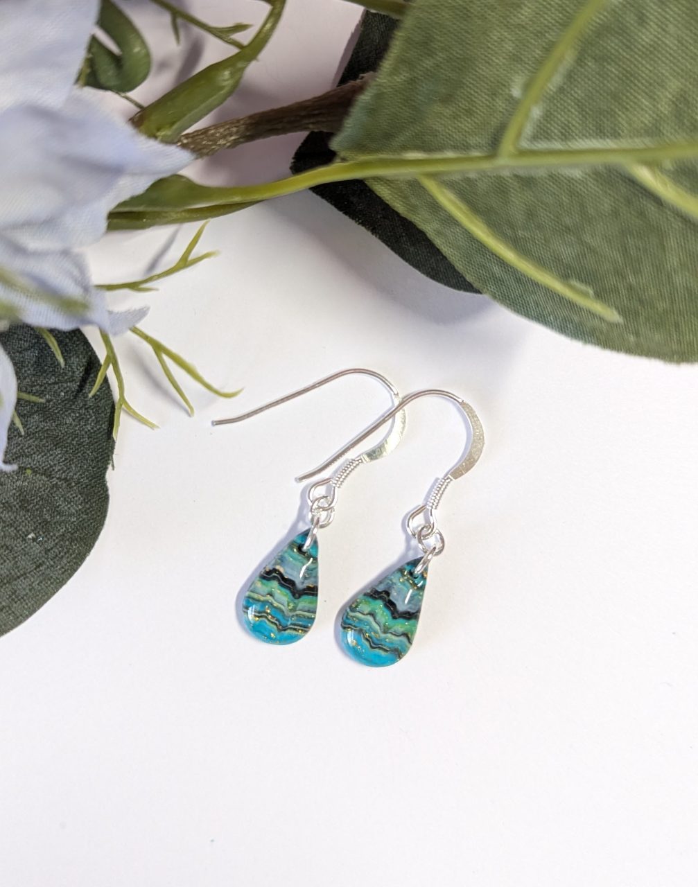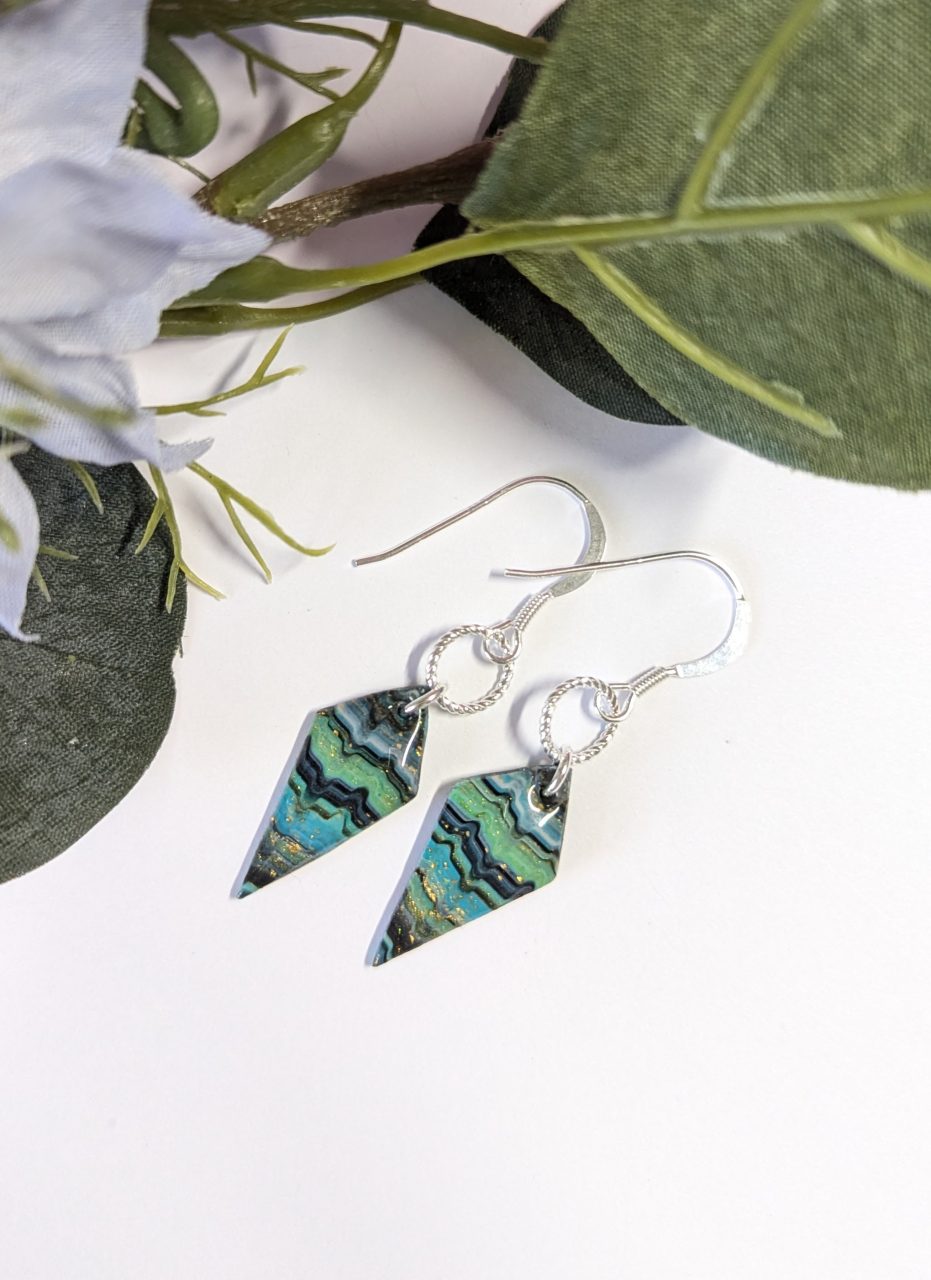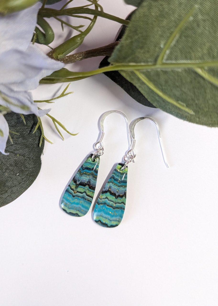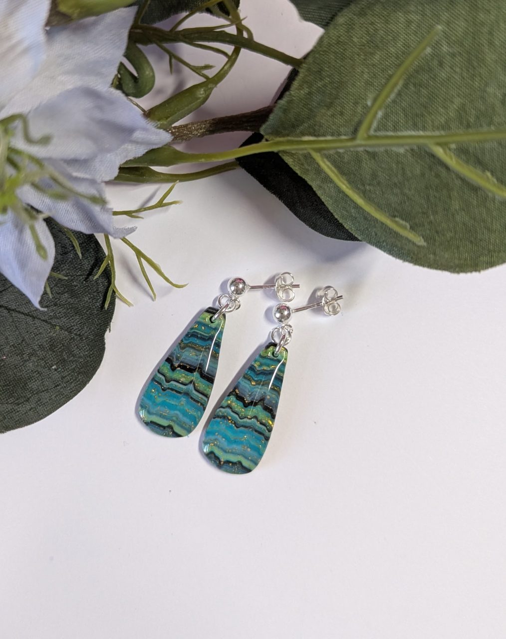 Ocean Waves collection Sterling Silver - beautiful mixed blues, greens and black clay using gold leaf for sparkle in a wavy pattern.