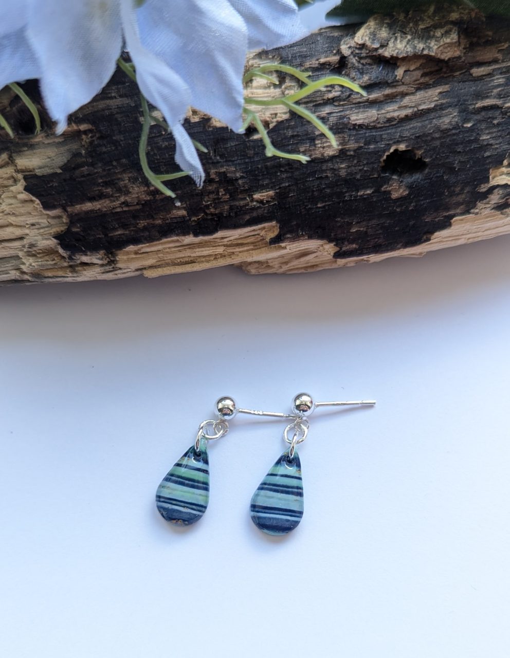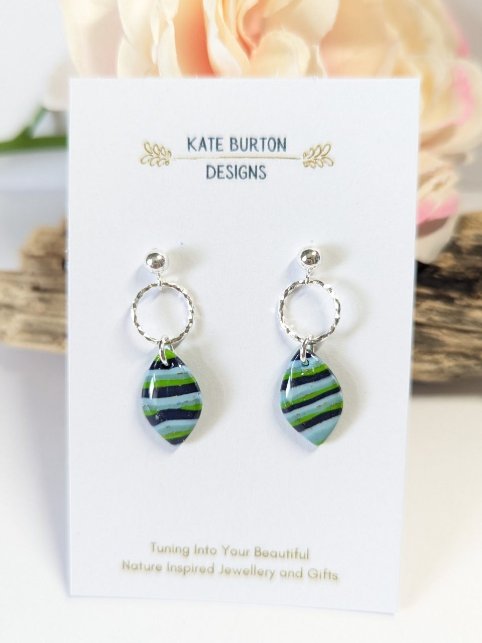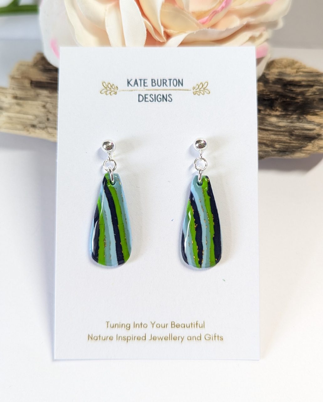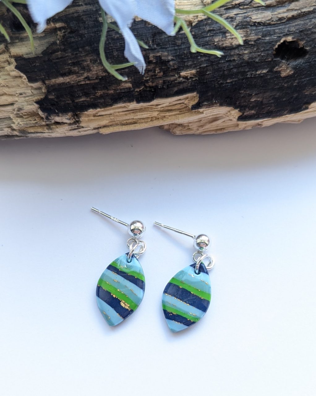 Stripes Sterling Silver Earring Collection - Beautiful blues and greens stripes pattern earrings with gold leaf layers. Colours of nature.