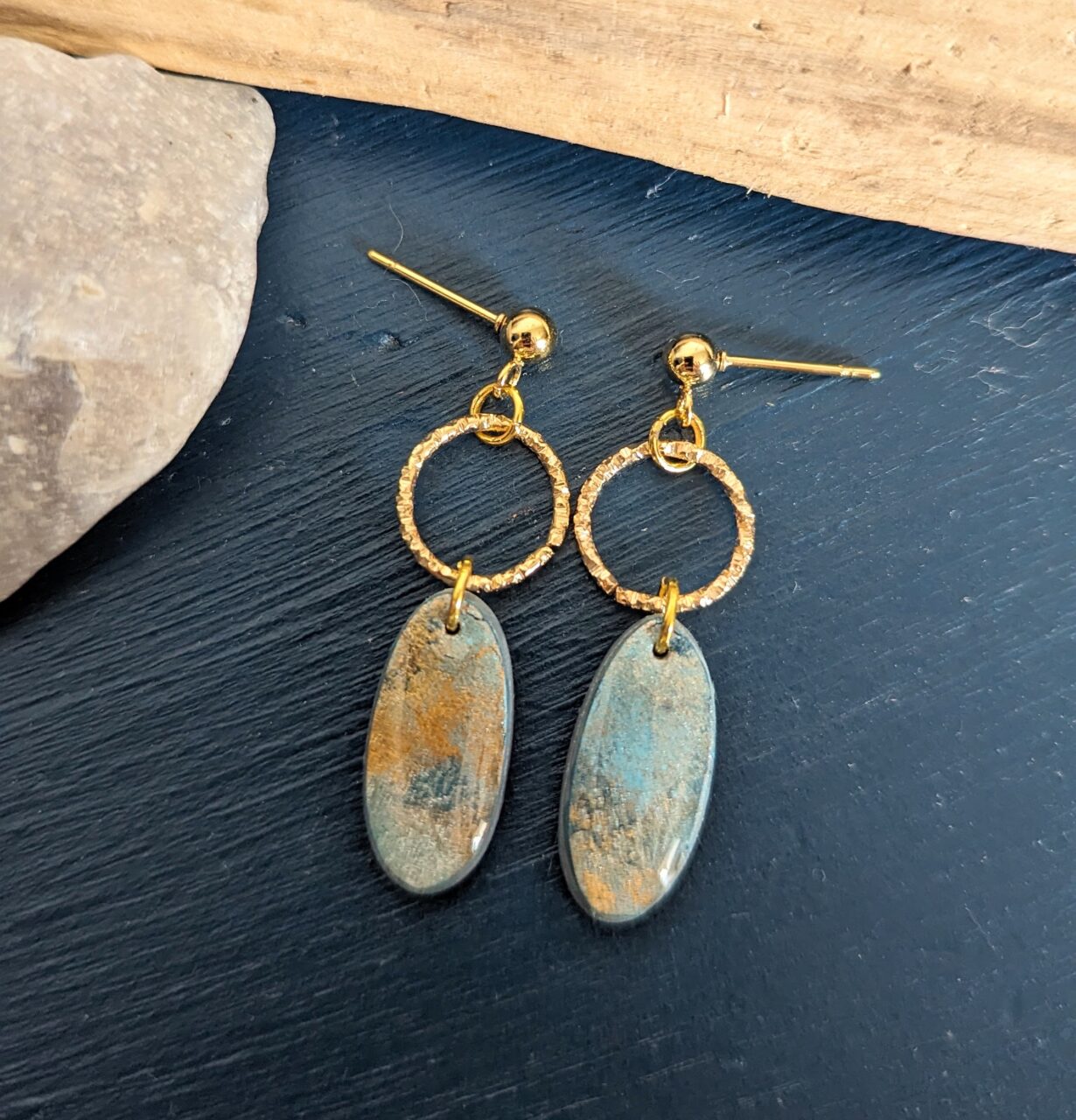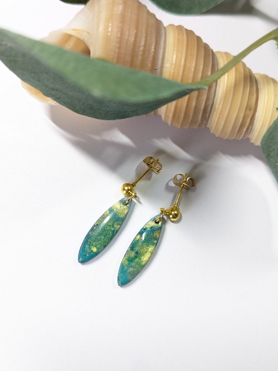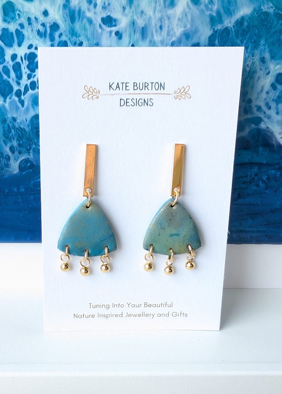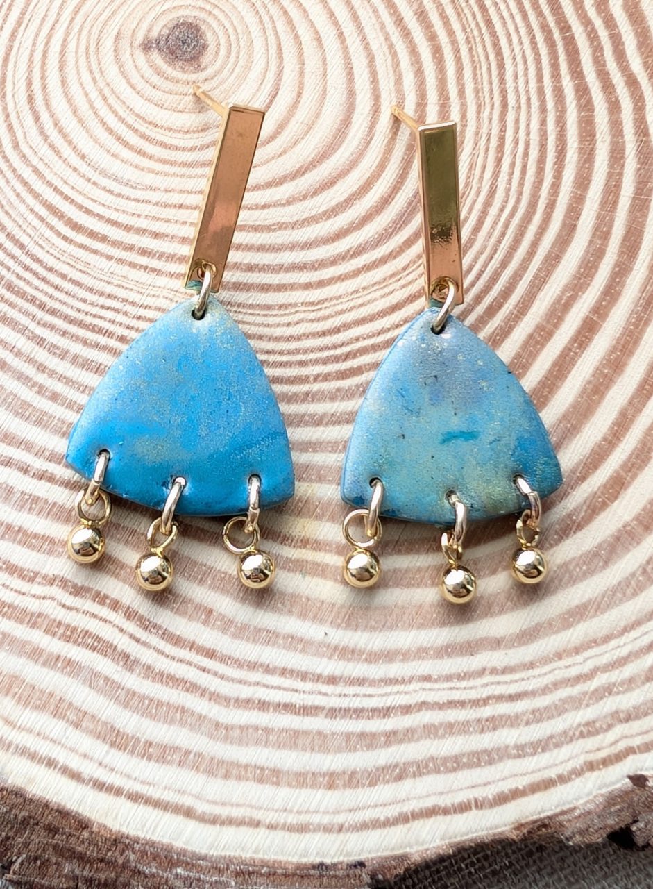 Various statement design earrings alcohol ink added to the clay to create this stunning opal/pale blue gold stone effect.