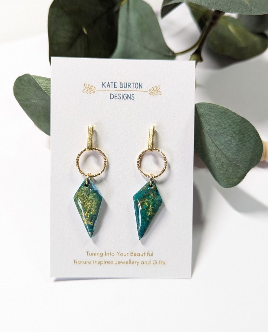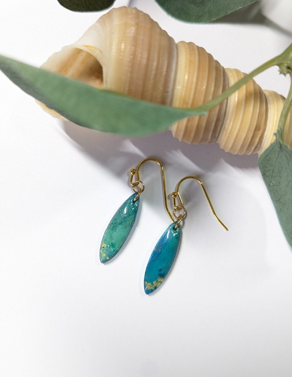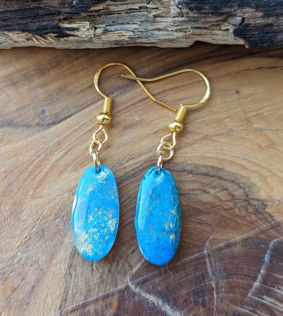 Various statement design earrings alcohol ink added to the clay to create this stunning opal/pale blue gold stone effect.