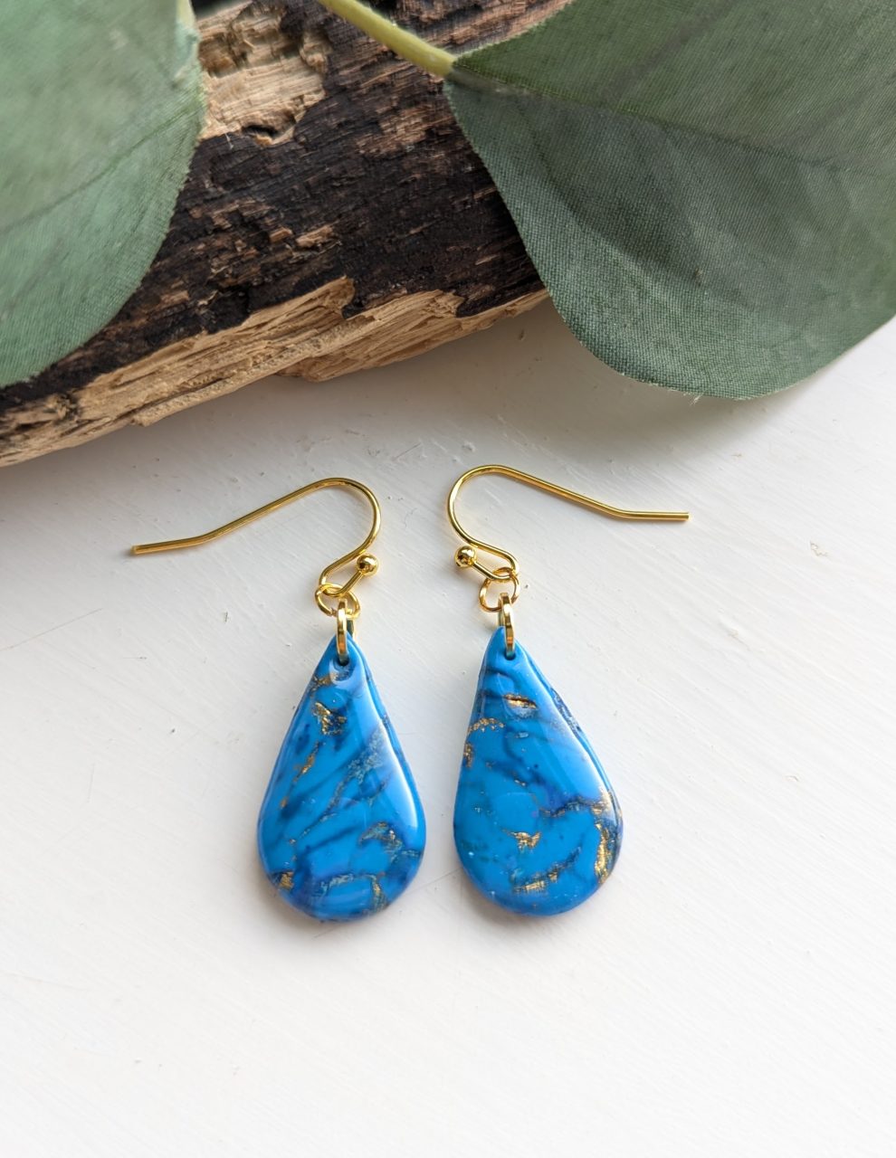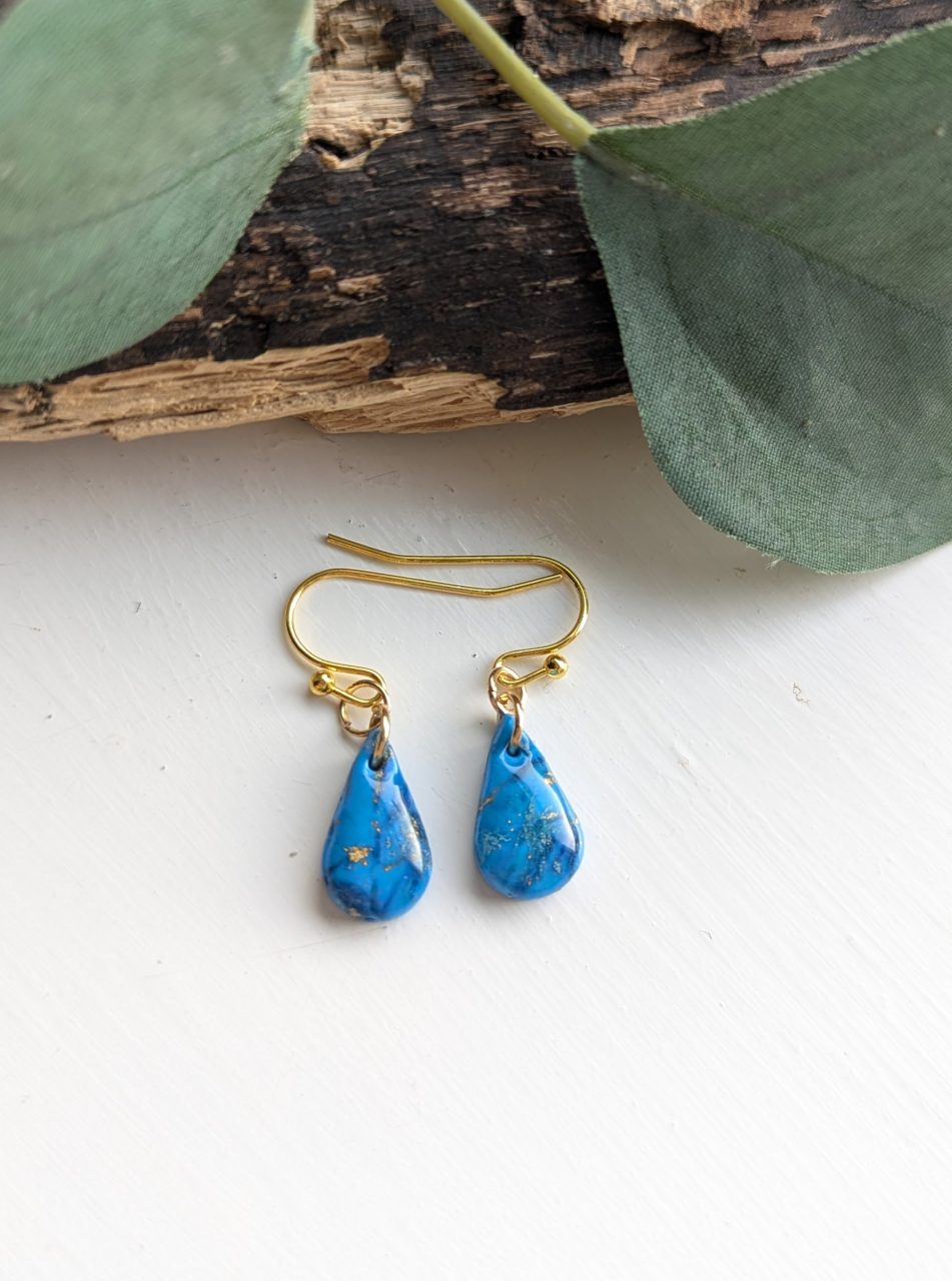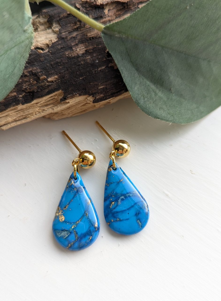 Turquoise Marble Earrings - Very pretty blue and gold marble effect earrings, the perfect accessory for every day. Gold leaf is mixed in with the clay to create the marble effect.